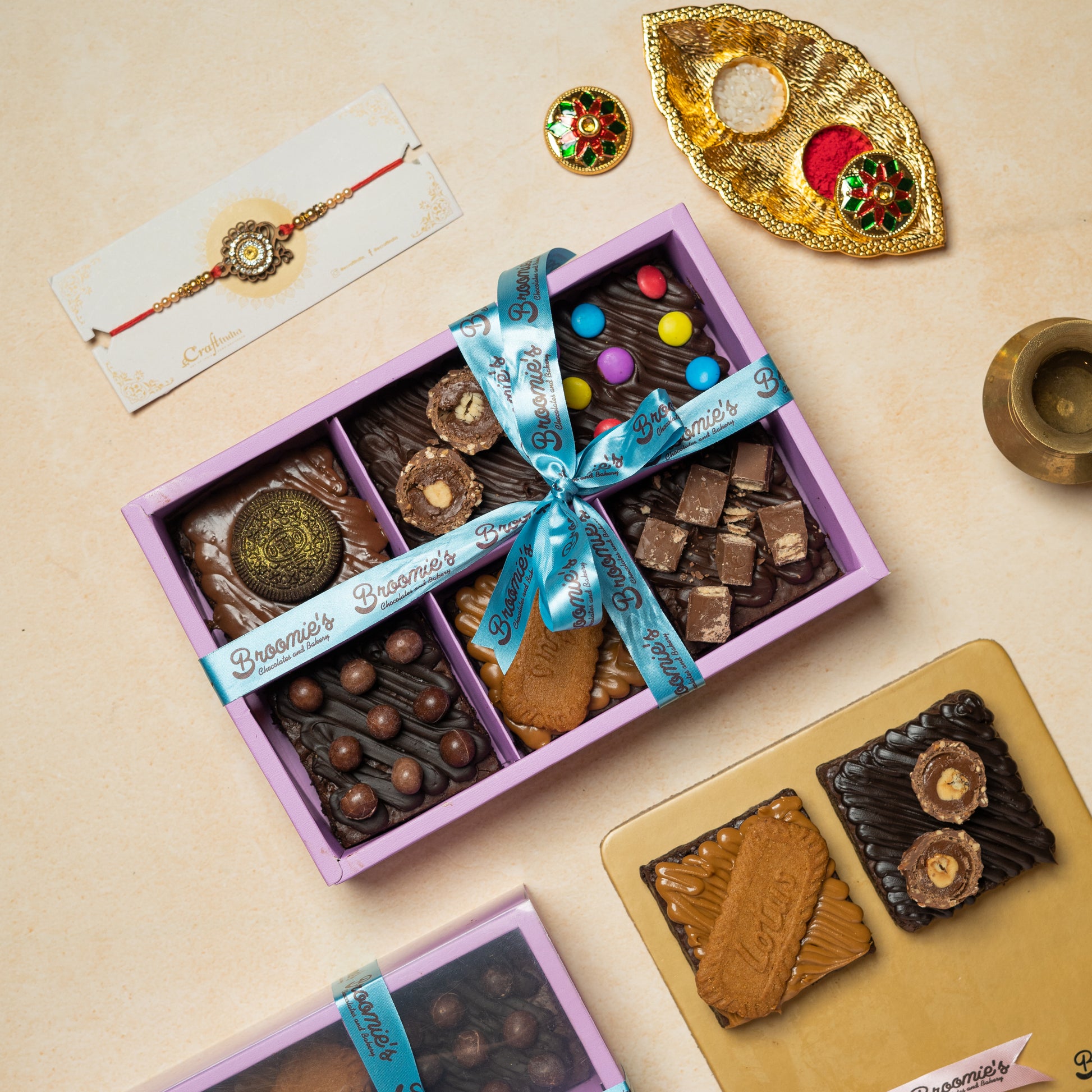 A decadent selection of 6 rich, fudgy brownies in assorted flavors. From classic chocolate to indulgent varieties like lotus Biscoff, Oreo, belgium chocolate and more—each bite is a delightful surprise. Perfect for gifting, celebrations, or simply treating yourself to a little everyday luxury.
