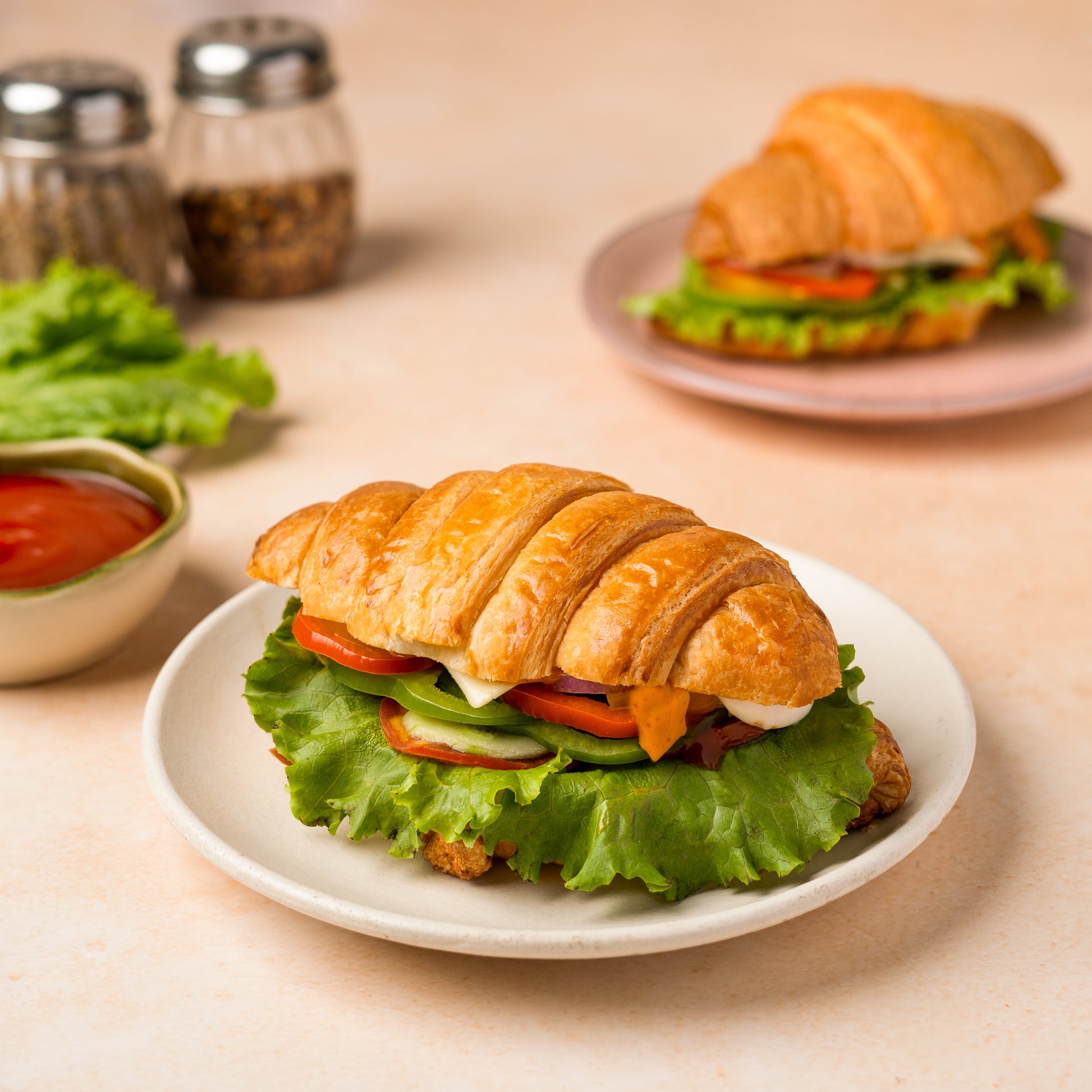 A Veg Croissant Sandwich is a delicious and flaky pastry-based sandwich filled with fresh, flavorful vegetables and often a variety of spreads or sauces. The sandwich is made using a golden, buttery croissant, which adds a light, airy texture and a rich, slightly sweet flavor that contrasts beautifully with the savory ingredients inside