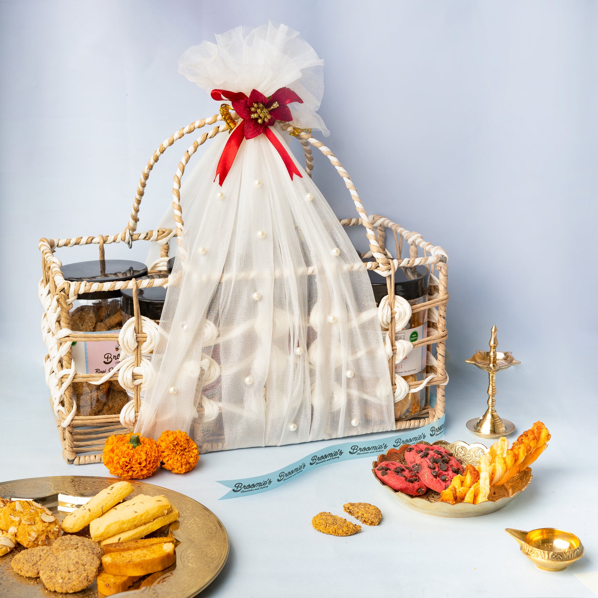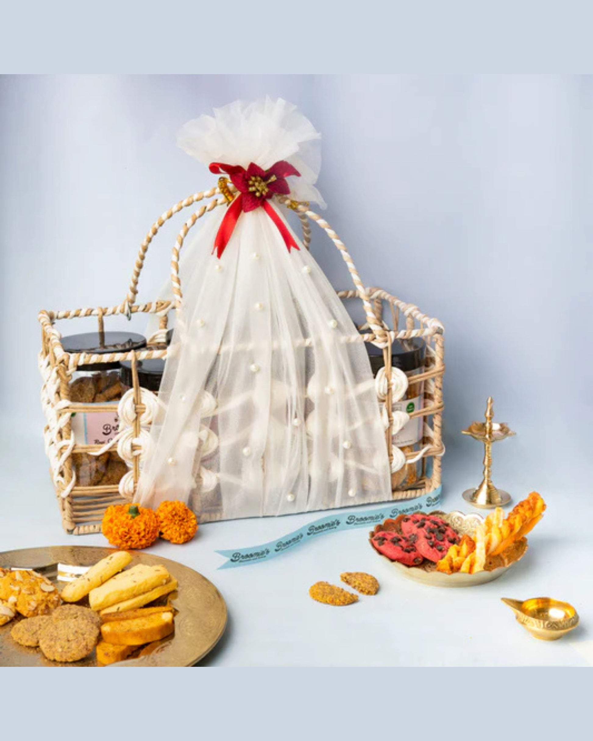 A cookies hamper is a gift basket or box filled with a variety of cookies. This hamper is popular for special occasions like birthdays, holidays, or as corporate gifts. It contain an assortment of cookies such as chocolate chip, oatmeal, shortbread, and even specialty cookies like macarons or biscotti. It also include other treats like chocolates, and is designed to appeal to a wide range of tastes.
