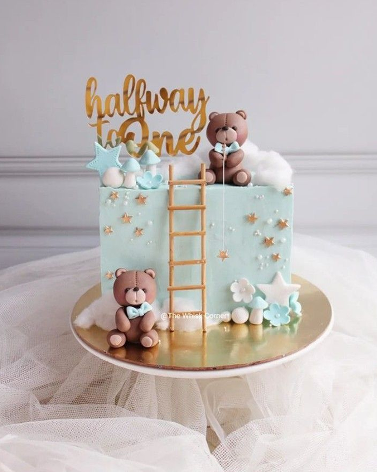Perfect for half-birthdays, baby showers, or first-year celebrations, this cake captures the magic of childhood dreams — where teddies, stars, and clouds come together in a whimsical sky of sweetness.