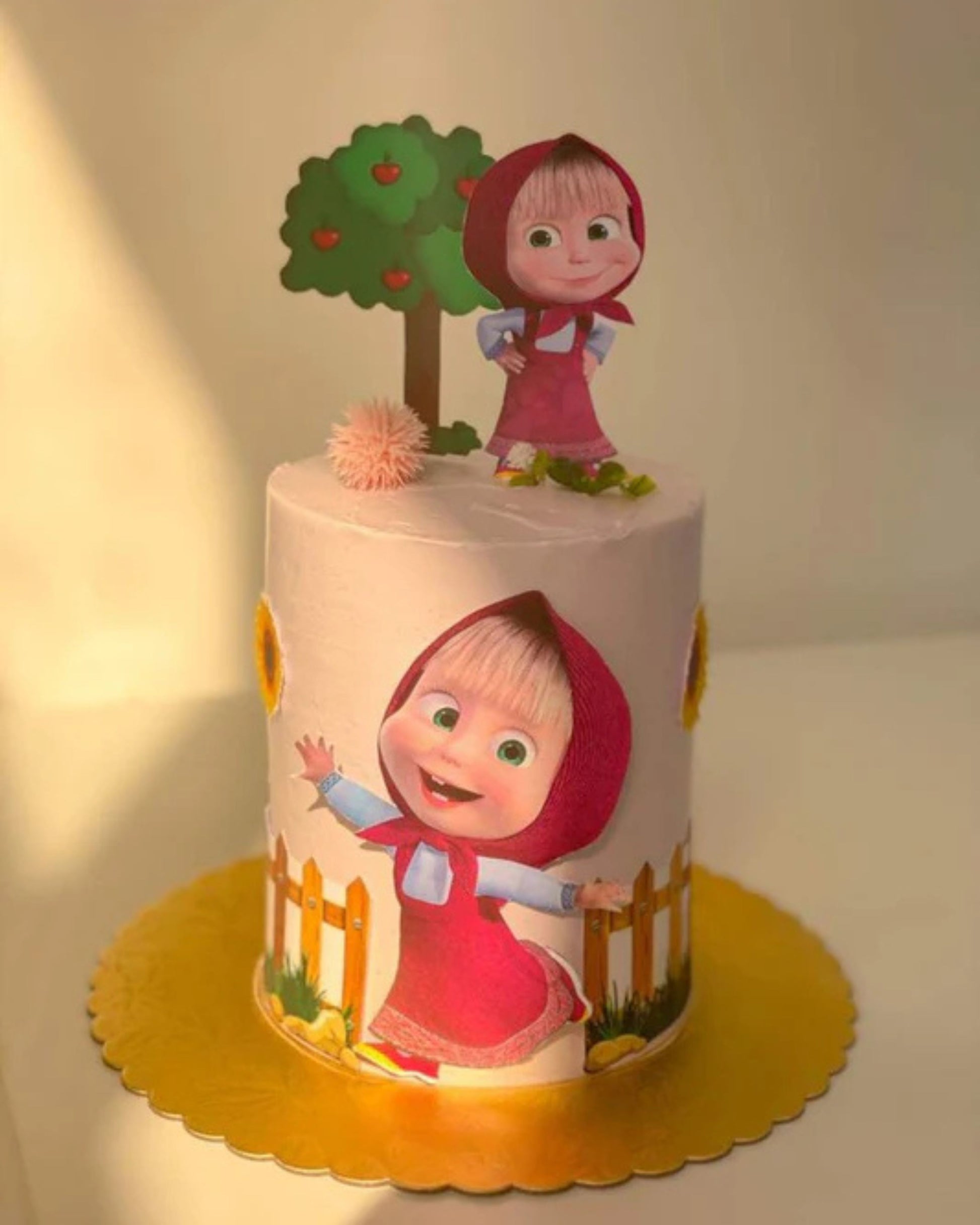 This charming cake is inspired by the beloved characters from the animated show, Masha and the Bear. The cake is designed to be fun and playful, with vibrant colors and adorable details that capture the essence of the show.