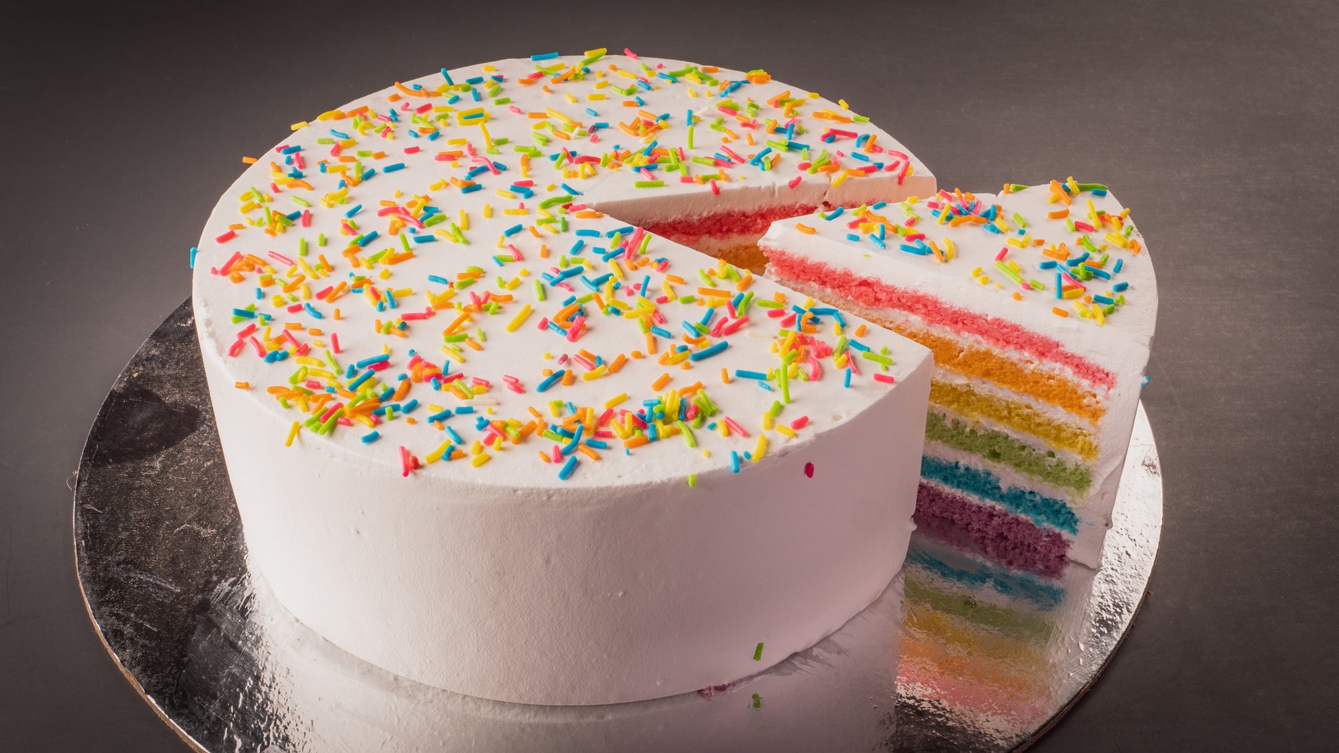 Rainbow Cake is a visually stunning, multi-layered dessert that features vibrant, colorful layers stacked one on top of the other, resembling the colors of the rainbow. Each layer is typically a different color—red, orange, yellow, green, blue, and violet—made using food coloring mixed into vanilla or white cake batter. Some versions are decorated with sprinkles, edible glitter, or even a surprise rainbow pattern inside.