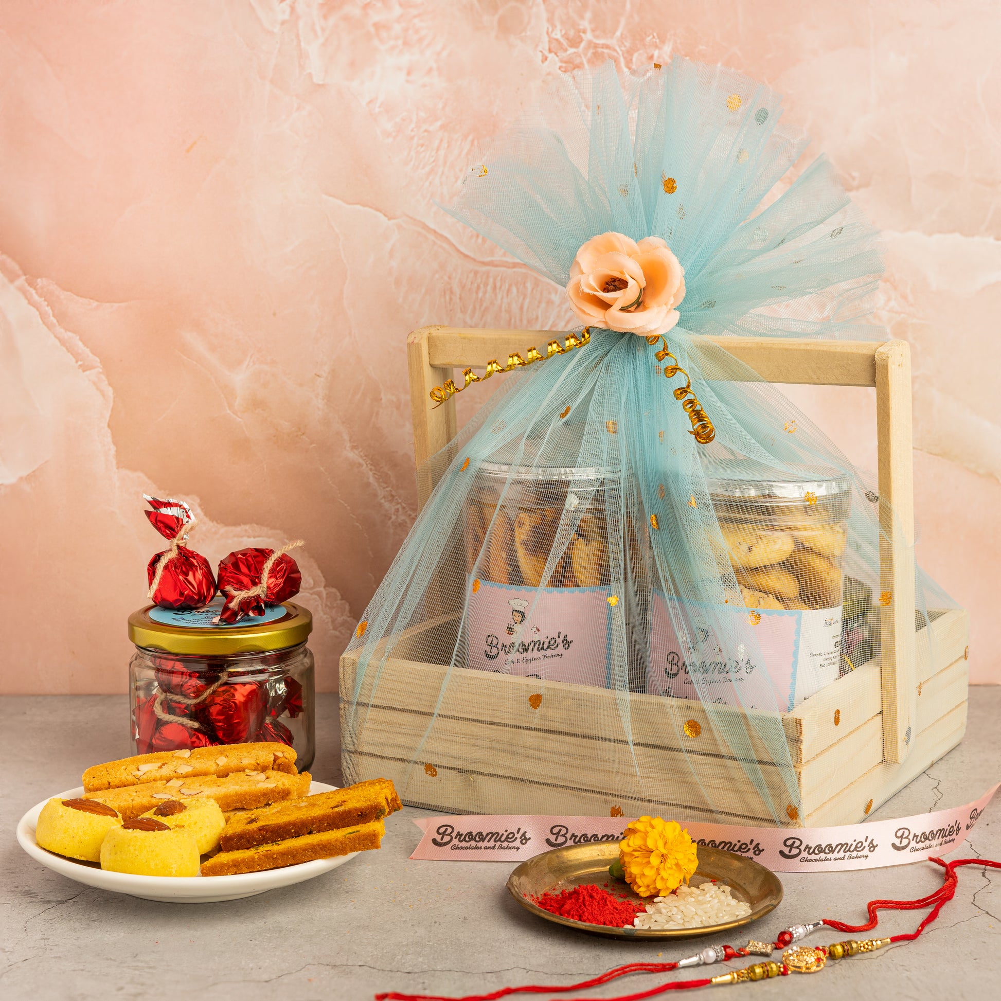 Indulge in the perfect blend of rustic charm and sweet delight with our Wooden Basket Cookie Hamper. From classic chocolate chip to buttery shortbread and nutty delights, each cookie is baked to perfection using high-quality ingredients. Whether you're gifting for a celebration, saying thank you, or simply treating yourself, this hamper adds a warm, artisanal touch to any occasion.